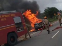 ರಸ್ತೆ ಮಧ್ಯೆ ಹೊತ್ತಿ ಉರಿದ ಕಾರು