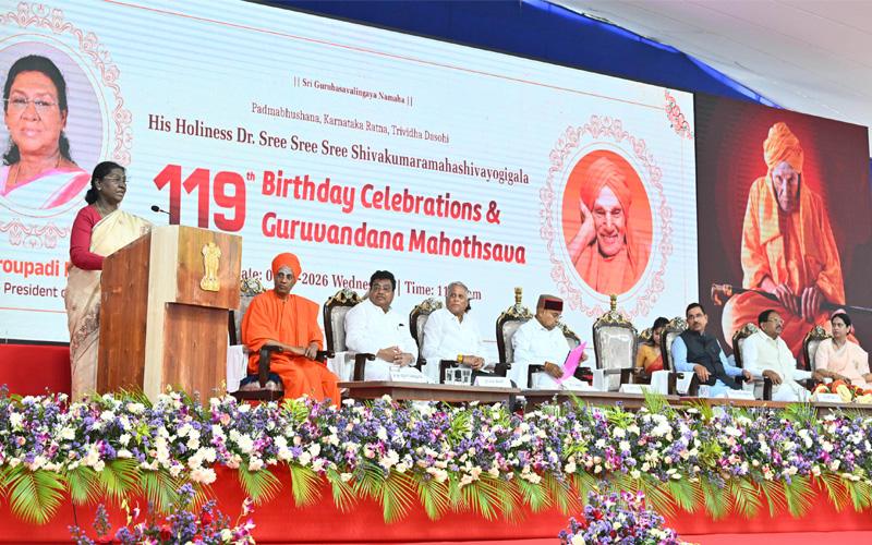 “ಸೇವೆಯೇ ಶ್ರೇಷ್ಠತೆ” – ರಾಷ್ಟ್ರಪತಿ ಸಂದೇಶ : ಗುರುವಂದನಾ ಮಹೋತ್ಸವದಲ್ಲಿ ಮಾತನಾಡಿದ ರಾಷ್ಟ್ರಪತಿಗಳು, ಶಿವಕುಮಾರ ಸ್ವಾಮೀಜಿಯವರಂತಹ ಮಹನೀಯರು ಸಮಾಜ ಮತ್ತು ರಾಷ್ಟ್ರದ ಆತ್ಮಸ್ವರೂಪವನ್ನು ಪ್ರತಿನಿಧಿಸುತ್ತಾರೆ ಎಂದು ಹೇಳಿದರು. 2019ರಲ್ಲಿ ದೇಹತ್ಯಾಗ ಮಾಡಿದರೂ, ಅವರ ಆಧ್ಯಾತ್ಮಿಕ ಶಕ್ತಿ ಇಂದಿಗೂ ಸಮಾಜವನ್ನು ದಾರಿದೀಪವಾಗಿಸಿದೆ ಎಂದು ಅವರು ಹೇಳಿದರು.