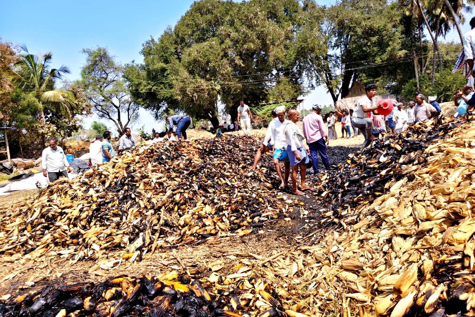 ವಿದ್ಯುತ್ ಶಾರ್ಟ್ ಸರ್ಕ್ಯೂಟ್ ನಿಂದ ಗೋವಿನ ಜೋಳದ ತೆನೆಗಳಿಗೆ ಬೆಂಕಿ ತಗುಲಿದ್ದು ಬೆಂಕಿ ನಂದಿಸಲು ಟ್ರ್ಯಾಕ್ಟರ್ ಟ್ಯಾಂಕರ್ ಮೂಲಕ ನೀರುತಂದು ರೈತರು ಗ್ರಾಮಸ್ಥರು ಬೆಂಕಿ ನಂದಿಸುವಲ್ಲಿ ಹರಸಾಹಸಪಟ್ಟರು. ಬೆಂಕಿ ನಂದಿಸುವಷ್ಟರಲ್ಲಿ ಸುಮರು 6ಕ್ಕೂ ಅಧಿಕ ಟ್ರ್ಯಾಕ್ಟರ್ ನಷ್ಟು ಗೋವಿನಜೋಳದ ರಾಶಿ ಸುಟ್ಟು ಕರಕಲಾದವು. ಗೋವಿನ ರಾಶಿಗೆ ಹೊತ್ತಿಕೊಂಡ ಬೆಂಕಿಯ ಕೆನ್ನಾಲಿಗೆ ಪಕ್ಕದಲ್ಲಿರುವ ಶೆಡ್‌ಗೆ ಆವರಿಸಿದ್ದರಿಂದ ಸೆಡ್‌ನಲ್ಲಿರುವ ಹಿಟ್ಟಿನ ಗಿರಣ , ಪಂಪ್, ಕುಂಟಿ-ಕೂರಿಗೆ, ಸ್ಪಿಂಕ್ಲರ್ ಫೈಪ್ ಸೇರಿದಂತೆ ರೈತರ ಪರಿಕರಗಳು ಸುಟ್ಟು ಕರಕಲಾಗಿವೆ.