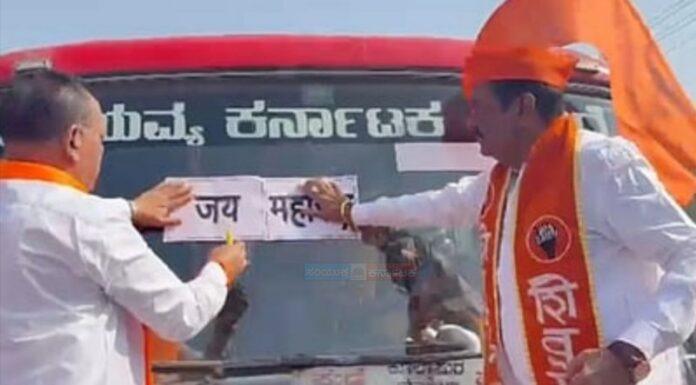 ರಾಜ್ಯ ರಸ್ತೆ ಸಾರಿಗೆ ಸಂಸ್ಥೆಯ ಬಸ್‌ಗೆ ‘ಜೈ ಮಹಾರಾಷ್ಟ್ರ’ ಸ್ಟಿಕ್ಕರ್: ಮಹಾಮೇಳಾವ್‌ಗೆ ಅನುಮತಿ ನೀಡದ ಹಿನ್ನೆಲೆಯಲ್ಲಿ ಕೊಲ್ಹಾಪುರದಲ್ಲಿ ಶಿವಸೇನೆ ಕಾರ್ಯಕರ್ತರು ಪುಂಡಾಟ ಮೆರೆದಿದ್ದಾರೆ. ಕರ್ನಾಟಕದ ಸಾರಿಗೆ ಬಸ್ ತಡೆದು ‘ಜೈ ಮಹಾರಾಷ್ಟ್ರ’ ಎಂದು ಸ್ಟೀಕರ್ ಅಂಟಿಸಿ ಉದ್ಧಟತನ ಪ್ರದರ್ಶಿಸಿದ್ದಾರೆ.