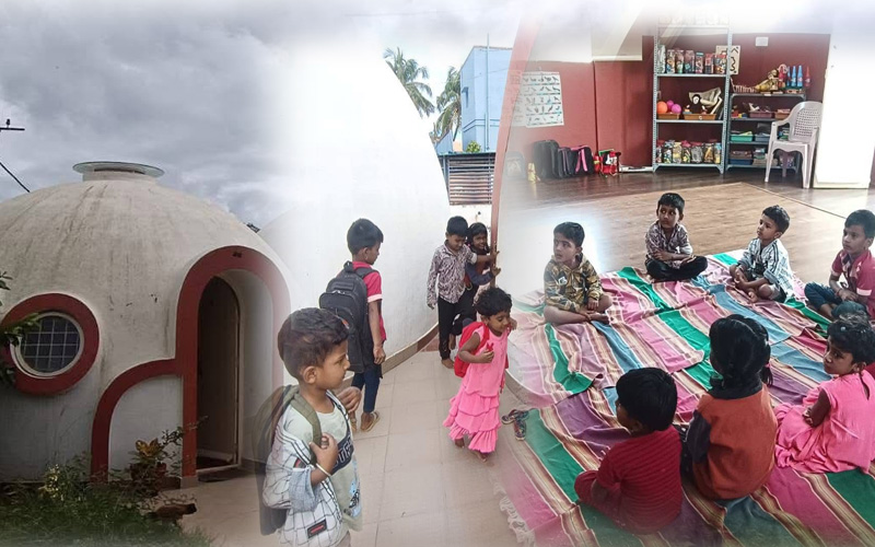 ಬೆಂಗಳೂರು: ಬೆಂಗಳೂರು ಗ್ರಾಮಾಂತರ ಜಿಲ್ಲೆಯ ದೊಡ್ಡಬಳ್ಳಾಪುರ ತಾಲ್ಲೂಕಿನ ರಾಜಘಟ್ಟ ಗ್ರಾಮ ಪಂಚಾಯಿತಿ ತನ್ನದೇ ಆದ ವಿಶಿಷ್ಟ ಪ್ರಯತ್ನದ ಮೂಲಕ ಮಕ್ಕಳಿಗೆ ಮನರಂಜನೆಯ ಜೊತೆಗೆ ಶಿಕ್ಷಣಕ್ಕೂ ಪ್ರೋತ್ಸಾಹ ನೀಡುವ ಉದ್ದೇಶದಿಂದ ಗುಮ್ಮಟಾಕಾರದ ವಿನ್ಯಾಸದ ಅಂಗನವಾಡಿ ಕಟ್ಟಡವನ್ನು ನಿರ್ಮಿಸಿದೆ.