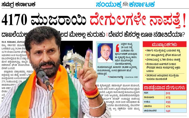 ಸರಣಿ ಪ್ರಶ್ನೆಗಳು: ಸಂಯುಕ್ತ ಕರ್ನಾಟಕ ದಿನಪತ್ರಿಕೆಯಲ್ಲಿ ಪ್ರಕಟವಾದ ವರದಿಯನ್ನು ಸಾಮಾಜಿಕ ಜಾಲತಾಣದಲ್ಲಿ ಹಂಚಿಕೊಂಡಿರುವ ಸಿ.ಟಿ. ರವಿ, “ದಾಖಲೆಯಲ್ಲಿರುವ ದೇವಸ್ಥಾನಗಳು ವಾಸ್ತವವಾಗಿ ಎಲ್ಲಿಗೆ ಹೋದವು?” ಎಂದು ಪ್ರಶ್ನಿಸಿದ್ದಾರೆ? ದೇವಸ್ಥಾನಗಳು ನಾಪತ್ತೆಯಾಗಿದ್ದು ಹೇಗೆ? ಪೋಸ್ಟ್ನಲ್ಲಿ ಪ್ರಶ್ನೆಗಳ ಸುರಿಮಳೆಯನ್ನೇ ಸುರಿಸಿರುವ ಅವರು, ದೇವಾಲಯಗಳನ್ನು ಇಲ್ಲವಾಗಿಸಿದವರು ಯಾರು? ಮುಜರಾಯಿ ಇಲಾಖೆಯ ಅಧೀನದಲ್ಲಿದ್ದ ದೇವಸ್ಥಾನಗಳ ಆಸ್ತಿಗಳು ಏನಾದವು? ಒತ್ತುವರಿ ಆಗಿದ್ದರೆ, ಇಷ್ಟೊಂದು ಭಾರೀ ಪ್ರಮಾಣದ ಒತ್ತುವರಿ ಹೇಗೆ ನಡೆದಿದೆ? ಎಂದು ಸರಣಿ ಪ್ರಶ್ನೆಗಳನ್ನು ಮುಂದಿಟ್ಟಿದ್ದಾರೆ.
