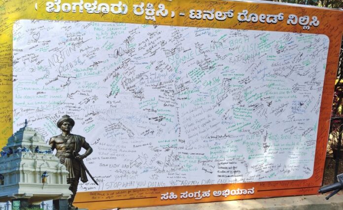 ಬೆಂಗಳೂರು: ರಾಜ್ಯ ಸರ್ಕಾರದ ವಿವಾದಿತ ಟನಲ್ ರೋಡ್ ಯೋಜನೆಗೆ (Tunnel Road Project) ವಿರೋಧ ವ್ಯಕ್ತಪಡಿಸಿದ ಬಿಜೆಪಿ ನಾಯಕರು, “ಟನಲ್ ರೋಡ್ ನಿಲ್ಲಿಸಿ – ಬೆಂಗಳೂರು ರಕ್ಷಿಸಿ” ಘೋಷಣೆಯಡಿ ಸಹಿ ಸಂಗ್ರಹ ಅಭಿಯಾನ ಪ್ರಾರಂಭಿಸಿದ್ದಾರೆ.
