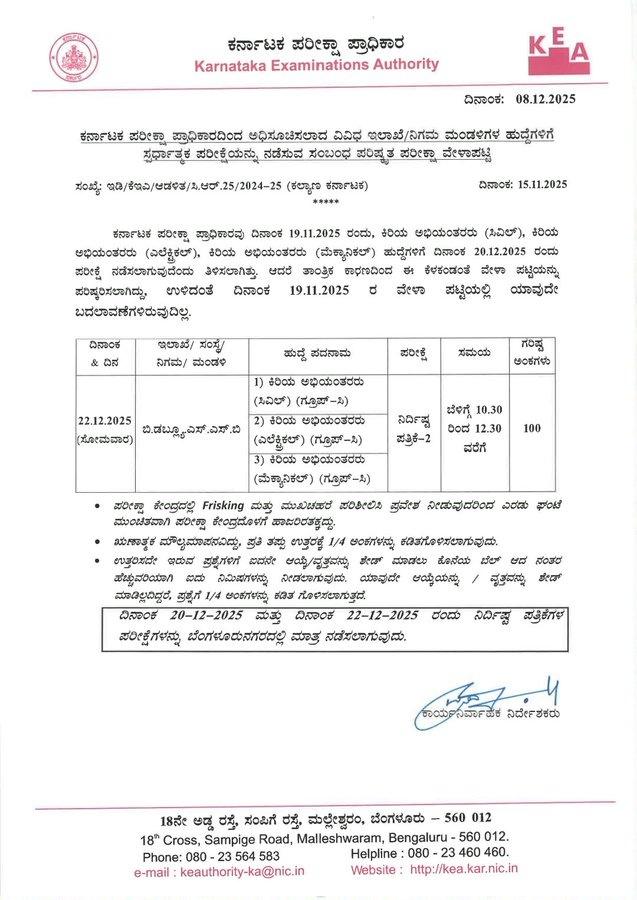 ಈ ಕುರಿತು ಅಧಿಕೃತ ಆದೇಶ ಹೊರಡಿಸಲಾಗಿದ್ದು. KEA ನ ನವೆಂಬರ್ 19ರ ವೇಳಾಪಟ್ಟಿಯಂತೆ ಇತರ ಹುದ್ದೆಗಳ ಪರೀಕ್ಷೆಗಳು ನಿಗದಿತ ದಿನಾಂಕಗಳಲ್ಲೇ ನಡೆಯಲಿದ್ದು, ಯಾವುದೇ ಬದಲಾವಣೆಯಿಲ್ಲ ಎಂದು ಸ್ಪಷ್ಟಪಡಿಸಲಾಗಿದೆ.