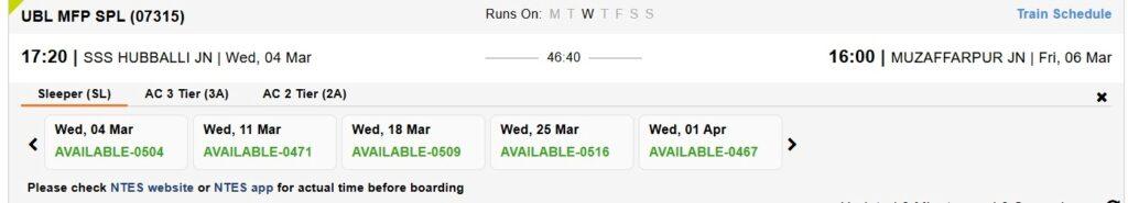 ರೈಲು ಸಂಖ್ಯೆ 07315 ಎಸ್ಎಸ್ಎಸ್ ಹುಬ್ಬಳ್ಳಿ–ಮುಜಾಫರ್ಪುರ ವಿಶೇಷ ಎಕ್ಸ್ಪ್ರೆಸ್: ಮಾರ್ಚ್ 4ರಿಂದ ಏಪ್ರಿಲ್ 1, 2026ರವರೆಗೆ ಪ್ರತಿ ಬುಧವಾರ ಸಂಜೆ 5.20ಕ್ಕೆ ಎಸ್ಎಸ್ಎಸ್ ಹುಬ್ಬಳ್ಳಿಯಿಂದ ಹೊರಟು, ಮೂರನೇ ದಿನ (ಶುಕ್ರವಾರ) ಸಂಜೆ 4.00ಕ್ಕೆ ಮುಜಾಫರ್ಪುರ ತಲುಪಲಿದೆ.