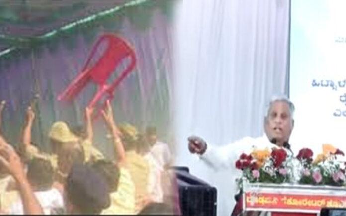ಕೊಪ್ಪಳ: ರೈಲ್ವೆ ಮೇಲ್ಸೇತುವೆ ಕಾಮಗಾರಿಯ ಶಂಕುಸ್ಥಾಪನೆ ಕಾರ್ಯಕ್ರಮದ ವೇಳೆ ಕೇಂದ್ರ ಸಚಿವ ವಿ. ಸೋಮಣ್ಣ ಅವರ ಮೇಲೆ ಕುರ್ಚಿ ತೂರಿರುವ ಘಟನೆ ಕೊಪ್ಪಳ ತಾಲೂಕಿನ ಹಿಟ್ನಾಳ ಗ್ರಾಮದಲ್ಲಿ ನಡೆದಿದೆ. ಈ ಘಟನೆಯಿಂದ ಸ್ಥಳದಲ್ಲಿ ಕೆಲಕಾಲ ಉದ್ವಿಗ್ನ ವಾತಾವರಣ ನಿರ್ಮಾಣವಾಯಿತು.