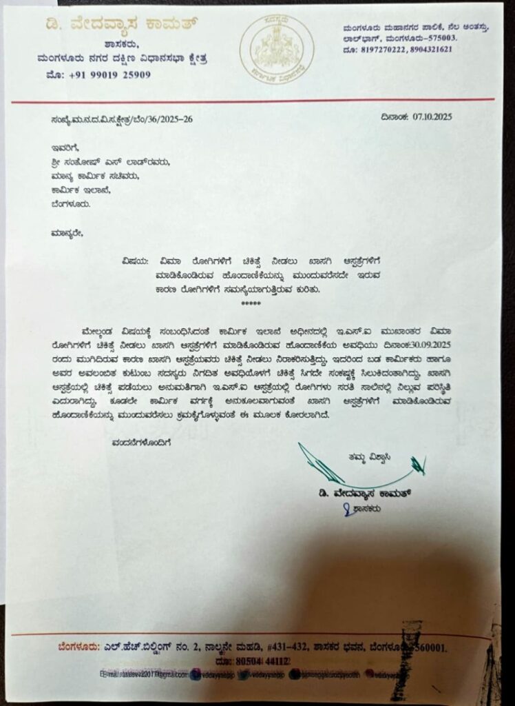 ಮಂಗಳೂರು: ಕಾರ್ಮಿಕರ ಆರೋಗ್ಯ ವಿಮೆ (ಇಎಸ್ಐ) ಅಡಿಯಲ್ಲಿ ಚಿಕಿತ್ಸೆ ಪಡೆಯುವ ವಿಮೆದಾರರು ಹಾಗೂ ಅವರ ಕುಟುಂಬ ಸದಸ್ಯರಿಗೆ ರಾಜ್ಯ ಕಾಂಗ್ರೆಸ್ ಸರ್ಕಾರದ ನಿರ್ಲಕ್ಷ್ಯದಿಂದಾಗಿ ವೈದ್ಯಕೀಯ ಸೌಲಭ್ಯ ಪಡೆಯುವಲ್ಲಿ ತೀವ್ರ ತೊಂದರೆಯಾಗುತ್ತಿದ್ದು ಇನ್ನೂ ಸಹ ಸರ್ಕಾರ ಎಚ್ಚೆತ್ತುಕೊಳ್ಳದಿರುವುದು ಖಂಡನೀಯವೆಂದು ಶಾಸಕ ವೇದವ್ಯಾಸ ಕಾಮತ್ ಆಕ್ರೋಶ ವ್ಯಕ್ತಪಡಿಸಿದರು.
