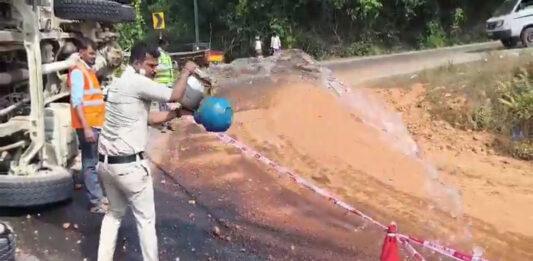 ಸಿದ್ದಾಪುರ: ಜಲ್ಲಿ ತುಂಬಿದ್ದ ಲಾರಿ ಪಲ್ಟಿ, ಡೀಸೆಲ್ ಸೋರಿಕೆ – 112 ಸಿಬ್ಬಂದಿ ಸಮಯಪ್ರಜ್ಞೆ