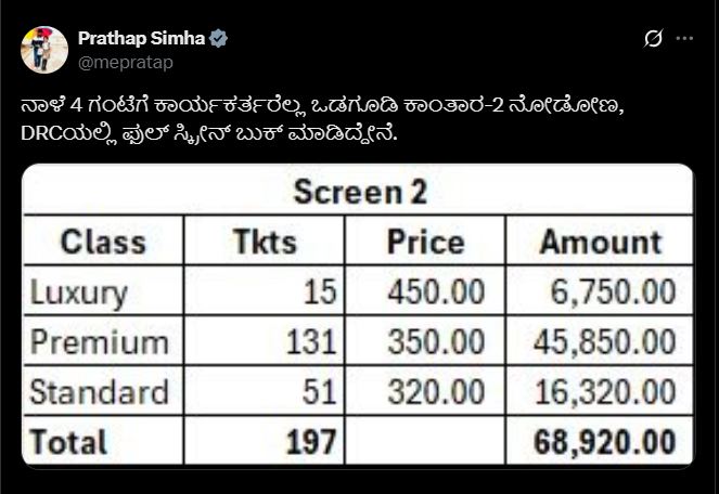 ಈ ಕುರಿತಂತೆ ಪ್ರತಾಪ್ ಸಿಂಹ ತಮ್ಮ ಸಾಮಾಜಿಕ ಜಾಲತಾಣದಲ್ಲಿ ಪೋಸ್ಟ್ ಮಾಡಿ – “ಎಲ್ಲರೂ ಬನ್ನಿ, ಕಾಂತಾರ ನೋಡೋಣ! ನಾನು ಎಲ್ಲರಿಗೂ ಟಿಕೆಟ್ ಬುಕ್ ಮಾಡಿದ್ದೇನೆ” ಎಂದು ಅಭಿಮಾನಿಗಳಿಗೆ ಆಹ್ವಾನ ನೀಡಿದ್ದಾರೆ. ಮೈಸೂರಿನ ಡಿಆರ್‌ಸಿ ಸಿನೆಮಾಸ್‌ನಲ್ಲಿ ನಾಳೆ ಸಂಜೆ 4 ಗಂಟೆಯ ಪೂರ್ಣ ಶೋಗೆ ಒಟ್ಟಾರೆ ₹68,920 ಮೌಲ್ಯದ ಟಿಕೆಟ್‌ಗಳನ್ನು ಬುಕ್ ಮಾಡಲಾಗಿದೆ. ಈ ಮೂಲಕ ಬೃಹತ್ ಮಟ್ಟದಲ್ಲಿ ಬಿಜೆಪಿ ಕಾರ್ಯಕರ್ತರು, ಬೆಂಬಲಿಗರು ಹಾಗೂ ಅಭಿಮಾನಿಗಳು ಒಟ್ಟಾಗಿ ಚಿತ್ರ ವೀಕ್ಷಿಸಲು ಸಜ್ಜಾಗಿದ್ದಾರೆ.
