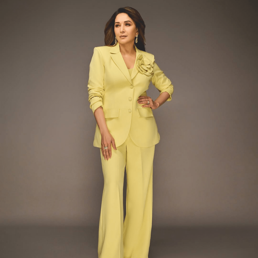 ಸಾಮಾನ್ಯವಾಗಿ ಮಾಧುರಿಯವರನ್ನು ಸೀರೆ ಅಥವಾ ಲೆಹೆಂಗಾಗಳಂತಹ ಸಾಂಪ್ರದಾಯಿಕ ಉಡುಗೆಗಳಲ್ಲಿ ನೋಡಿ ಅಭ್ಯಾಸವಿರುವ ಅಭಿಮಾನಿಗಳಿಗೆ, ಈ ‘ಪವರ್ ಸೂಟ್’ ಲುಕ್ ಒಂದು ಆಹ್ಲಾದಕರ ಆಶ್ಚರ್ಯವಾಗಿತ್ತು. ಅವರು ಧರಿಸಿರುವ ಈ ಹಳದಿ ಬಣ್ಣದ ಬ್ಲೇಜರ್ ಮತ್ತು ಪ್ಯಾಂಟ್ ಸೆಟ್ ಕೇವಲ ಸ್ಟೈಲಿಶ್ ಆಗಿ ಕಾಣುವುದು ಮಾತ್ರವಲ್ಲದೆ, ಅವರಿಗೆ ಒಂದು ವೃತ್ತಿಪರ ಹಾಗೂ ಆತ್ಮವಿಶ್ವಾಸದ ‘ಬಾಸ್ ಲೇಡಿ’ ಲುಕ್ ಅನ್ನು ನೀಡಿದೆ. ಐಷಾರಾಮಿ ಬಾಳೆಹಣ್ಣಿನ ಕ್ರೇಪ್ ಬಟ್ಟೆಯಿಂದ ಸಿದ್ಧಪಡಿಸಲಾದ ಈ ಹೂವಿನ ವಿನ್ಯಾಸದ ಬ್ಲೇಜರ್ ಮತ್ತು ಅಗಲವಾದ ಕಾಲಿನ ಪ್ಯಾಂಟ್ (wide-leg pants), ರಚನೆ ಮತ್ತು ಹರಿವು ಎರಡರ ನಡುವೆ ಅದ್ಭುತ ಸಮತೋಲನವನ್ನು ಕಾಪಾಡಿಕೊಂಡಿದೆ.