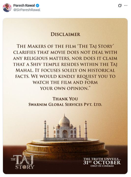 ಇತ್ತೀಚೆಗೆ ಪರೇಶ್ ರಾವಲ್ ಸಾಮಾಜಿಕ ಜಾಲತಾಣದಲ್ಲಿ ಮಾಡಿದ ಪೋಸ್ಟ್ ಚರ್ಚೆಗೆ ಕಾರಣವಾಯಿತು. “ನಿಮಗೆ ಸ್ಮಾರಕ ಗೊತ್ತಿದೆ, ಆದರೆ ಅದರ ನಿಜವಾದ ಕಥೆ ಗೊತ್ತಿದೆಯೇ? ವಿಶ್ವದ ಅತ್ಯಂತ ಸುಂದರವಾದ ಅದ್ಭುತದ ಹಿಂದಿನ ಸತ್ಯ ಈಗ ಬಹಿರಂಗಗೊಳ್ಳಲಿದೆ” ಎಂಬ ಬರಹವು ಸಂಚಲನ ಸೃಷ್ಟಿಸಿತು. ಇದಕ್ಕೆ ಪ್ರತಿಯಾಗಿ ಕೆಲವರು “ತಾಜ್ ಮಹಲ್ ಅನ್ನು ತೇಜೋ ಮಹಾಲಯ ಎಂದು ಹೇಳುವ ಪ್ರಚಾರ ಚಿತ್ರವನ್ನು ಮಾಡಿದವರೇ ಇದೀಗ ಇದೇ ಚಿತ್ರವನ್ನು ಮಾಡಿದ್ದಾರೆ” ಎಂದು ಟೀಕಿಸಿದರು.