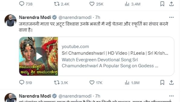 “ಜಗತ್ಜನನಿ ಮಾತೆಯ ಮೇಲಿನ ಅಚಲ ನಂಬಿಕೆಯು ಆಕೆಯ ಭಕ್ತರಲ್ಲಿ ಹೊಸ ಪ್ರಜ್ಞೆ ಮತ್ತು ಶಕ್ತಿಯನ್ನು ತುಂಬಲಿದೆ.” ಎಂದು, ಮಾತೆ ಚಾಮುಂಡೇಶ್ವರಿಯ ಆಶೀರ್ವಾದದ ಶಕ್ತಿಯನ್ನು ಪ್ರಧಾನಿಯವರು ಕೊಂಡಾಡಿದ್ದಾರೆ. ದೈವಿಕ ಶಕ್ತಿಯು ಮನುಷ್ಯನಲ್ಲಿ ಹೇಗೆ ಚೈತನ್ಯ ತುಂಬುತ್ತದೆ ಎಂಬುದನ್ನು ಈ ಹಾಡಿನ ಮೂಲಕ ಜಗತ್ತಿಗೆ ಫೋಸ್ಟ್‌ ಮಾಡುವ ಮೂಲಕ ಸಾರಿದ್ದಾರೆ.