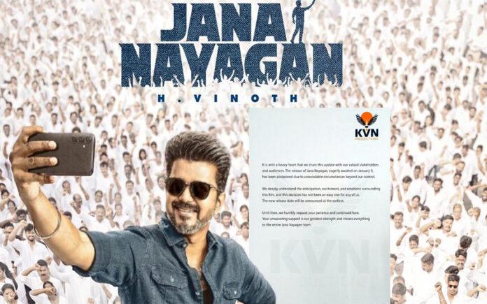 “ಕೆಲವು ತಾಂತ್ರಿಕ ಮತ್ತು ನಿರ್ಮಾಣ ಸಂಬಂಧಿತ ಕಾರಣಗಳಿಂದ ಜನವರಿ 9ರಂದು ಬಿಡುಗಡೆಯಾಗಬೇಕಿದ್ದ ‘ಜನ ನಾಯಗನ್’ ಚಿತ್ರವನ್ನು ಮುಂದೂಡಲಾಗಿದೆ. ಅಭಿಮಾನಿಗಳ ಉತ್ಸಾಹ ಮತ್ತು ಭಾವನೆಗಳನ್ನು ನಾವು ಸಂಪೂರ್ಣವಾಗಿ ಅರ್ಥಮಾಡಿಕೊಂಡಿದ್ದೇವೆ. ಚಿತ್ರದ ಹೊಸ ಬಿಡುಗಡೆ ದಿನಾಂಕವನ್ನು ಆದಷ್ಟು ಬೇಗ ಪ್ರಕಟಿಸಲಾಗುವುದು. ಅಲ್ಲಿಯವರೆಗೆ ಎಲ್ಲರೂ ತಾಳ್ಮೆಯಿಂದ ಇರಬೇಕೆಂದು ವಿನಂತಿಸುತ್ತೇವೆ. ನಿಮ್ಮ ಬೆಂಬಲವೇ ನಮ್ಮ ದೊಡ್ಡ ಶಕ್ತಿಯಾಗಿದೆ” ಎಂದು ಕೆವಿಎನ್ ಪ್ರೊಡಕ್ಷನ್ಸ್ ಪ್ರಕಟಣೆಯಲ್ಲಿ ಉಲ್ಲೇಖಿಸಿದೆ.