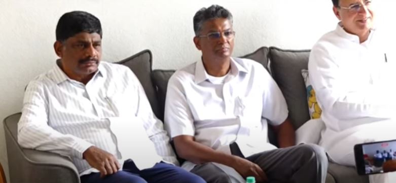 ಇಂದು ಕಾಂಗ್ರೆಸ್ ಭವನದಲ್ಲಿ ನಡೆದ ಕಾಂಗ್ರೆಸ್ ಶತಮಾನೋತ್ಸವ ಮರು ಕಾರ್ಯಕ್ರಮದ ಸಿದ್ದತೆ ಸಭೆಯಲ್ಲಿ ರಾಜ್ಯ ಕಾಂಗ್ರೆಸ್ ಉಸ್ತುವಾರಿ ರಣದೀಪ್ ಸಿಂಗ್ ಸುರ್ಜೇವಾಲ ಜೊತೆ ಜೊತೆಗೆ ಸಚಿವ ಸತೀಶ್ ಜಾರಕಿಹೊಳಿ ಹಾಗೂ ಮಾಜಿ ಸಂಸದ ಡಿ.ಕೆ.ಸುರೇಶ ಅಕ್ಕ-ಪಕ್ಕ ಕುಳಿತು ಗಮನಸೆಳೆದರು.