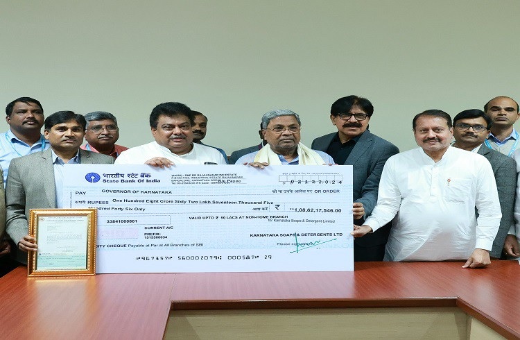 ಬೆಂಗಳೂರು: ಕರ್ನಾಟಕ ಸೋಪ್ಸ್ ಅಂಡ್ ಡಿಟರ್ಜೆಂಟ್ಸ್(ಕೆಎಸ್‌ಡಿಎಲ್) ಕಾರ್ಖಾನೆಯು 2023-24ನೇ ಸಾಲಿನಲ್ಲಿ ಮಾಡಿರುವ 362.07 ಕೋಟಿ ರೂಪಾಯಿ ಲಾಭದ ಪೈಕಿ 108.62 ಕೋಟಿ ರೂಪಾಯಿಗಳ ಲಾಂಭಾಂಶದ ಚೆಕ್ ಅನ್ನು ಮುಖ್ಯಮಂತ್ರಿ ಸಿದ್ದರಾಮಯ್ಯ ಅವರಿಗೆ ಬೃಹತ್ ಮತ್ತು ಮಧ್ಯಮ ಕೈಗಾರಿಕಾ ಸಚಿವ ಎಂ.ಬಿ. ಪಾಟೀಲ ಮತ್ತು ಕಾರ್ಖಾನೆ ಅಧ್ಯಕ್ಷ ಸಿ.ಎಸ್. ನಾಡಗೌಡ ಅವರು ಹಸ್ತಾಂತರಿಸಿದರು.
