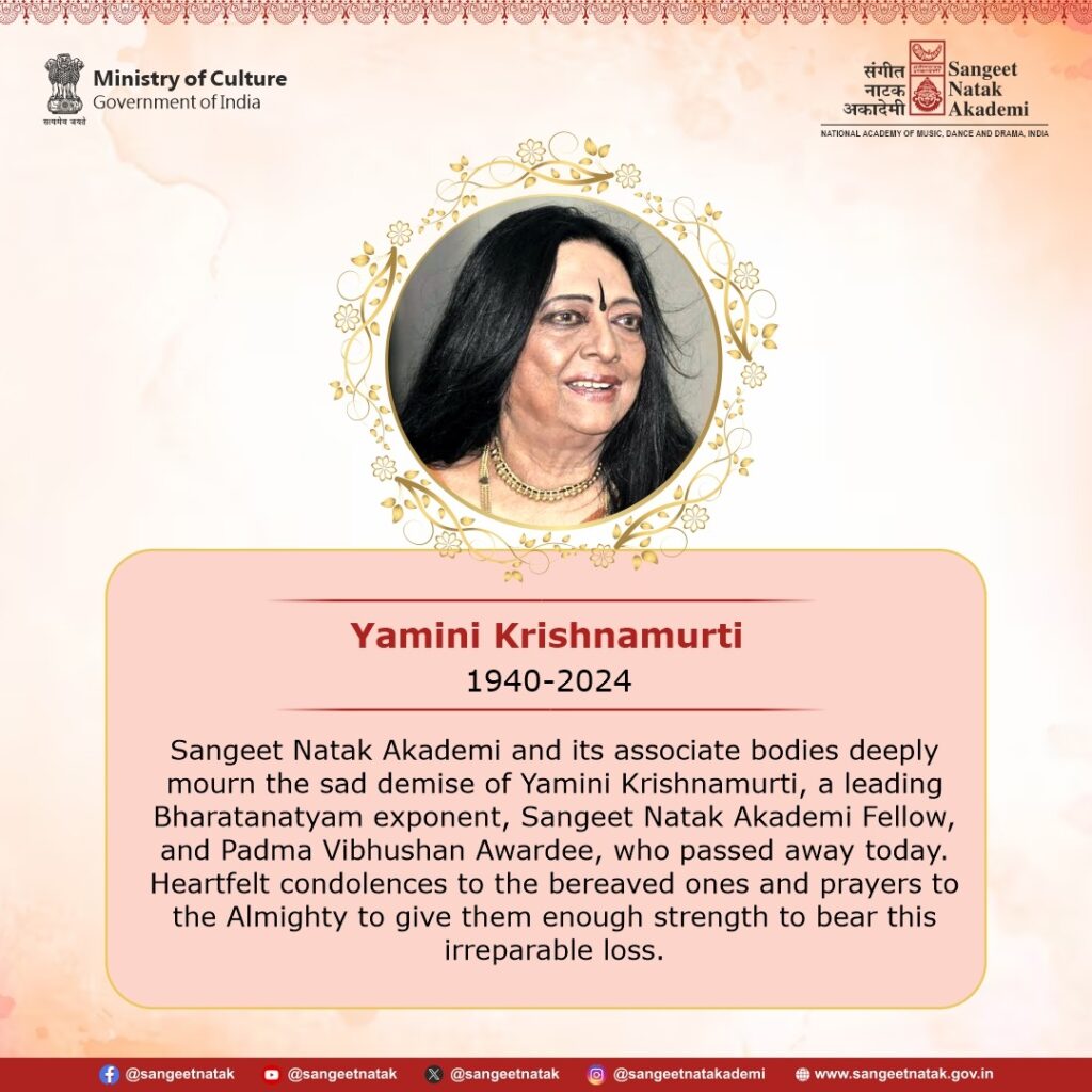 ನವದೆಹಲಿ: ಪದ್ಮಾ ಪ್ರಶಸ್ತಿ ಪುರಸ್ಕೃತ ನೃತ್ಯ ಕಲಾವಿದೆ ಯಾಮಿನಿ ಕೃಷ್ಣಮೂರ್ತಿ ನಿಧನರಾಗಿದ್ದಾರೆ.