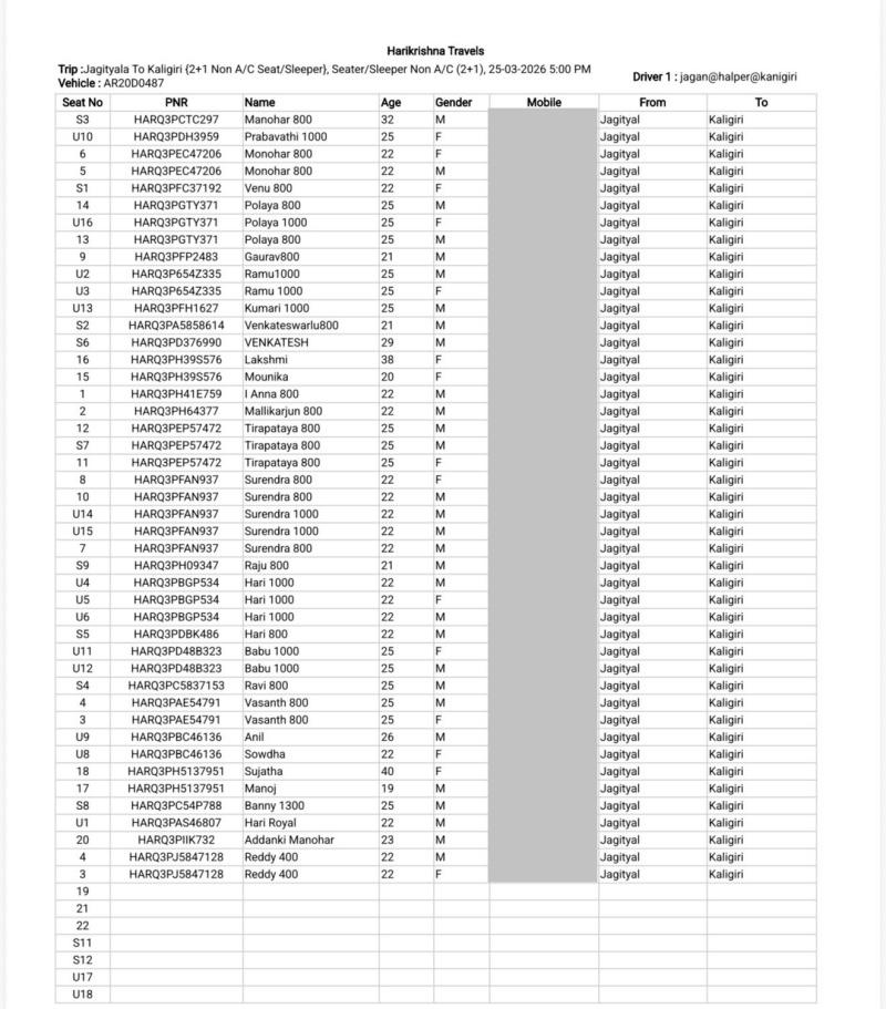 ಸೆಮಿ ಸ್ಲೀಪರ್ ಬಸ್ ಆಗಿದ್ದರಿಂದ ಪ್ರಯಾಣಿಕರು ಹೊರಬರಲು ಕಷ್ಟಪಟ್ಟರು. ಬಸ್ ಬಾಗಿಲು ಜಾಮ್ ಆದಾಗ ಕಿಟಕಿಗಳನ್ನು ಒಡೆದು ಹಲವಾರು ಪ್ರಯಾಣಿಕರು ಹೊರಗೆ ಹಾರಿದ್ದಾರೆ. ಮೃತರನ್ನು ಸಿಎಸ್ ಪುರಂ ಮತ್ತು ಕಾಳಿಗಿರಿ ನಿವಾಸಿಗಳು ಎಂದು ಗುರುತಿಸಲಾಗಿದೆ. ಟ್ರಾವೆಲ್ ಏಜೆನ್ಸಿಯ ಆಡಳಿತ ಮಂಡಳಿಯು ಪ್ರಯಾಣಿಕರ ಪಟ್ಟಿಯನ್ನು ಬಿಡುಗಡೆ ಮಾಡಿದ್ದು, ಸಾವಿನ ಸಂಖ್ಯೆ ಮತ್ತಷ್ಟು ಹೆಚ್ಚಾಗುವ ಸಾಧ್ಯತೆಯಿದೆ.