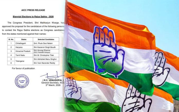 ನವದೆಹಲಿ: ಮುಂಬರುವ ರಾಜ್ಯಸಭಾ ಚುನಾವಣೆಗೆ ಹಿನ್ನೆಲೆಯಲ್ಲಿ Indian National Congress ಆರು ಅಭ್ಯರ್ಥಿಗಳ ಮೊದಲ ಪಟ್ಟಿಯನ್ನು ಪ್ರಕಟಿಸಿದೆ. ತೆಲಂಗಾಣದಿಂದ ಇಬ್ಬರು ಸೇರಿದಂತೆ ಛತ್ತೀಸ್ಗಢ, ಹರಿಯಾಣ, ಹಿಮಾಚಲ ಪ್ರದೇಶ ಮತ್ತು ತಮಿಳುನಾಡಿನಿಂದ ತಲಾ ಒಬ್ಬರನ್ನು ಪಕ್ಷ ಕಣಕ್ಕಿಳಿಸಿದೆ.