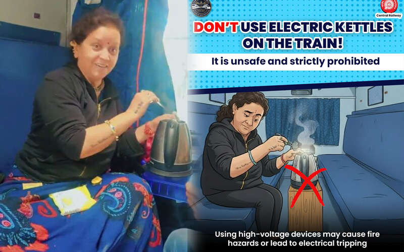 ಸೆಂಟ್ರಲ್ ರೈಲ್ವೆಯಿಂದ ಅಧಿಕೃತ ಎಚ್ಚರಿಕೆ: ವೀಡಿಯೊ ವೈರಲ್ ಆದ ಕೆಲವು ಗಂಟೆಗಳಲ್ಲೇ ಸೆಂಟ್ರಲ್ ರೈಲ್ವೆ ಅಧಿಕೃತ ಪ್ರಕಟಣೆ ಬಿಡುಗಡೆ ಮಾಡಿ “Trainನಲ್ಲಿ Electric Kettle, Induction Stove, High Voltage Appliances ಬಳಸುವುದು STRICTLY PROHIBITED. ಇದು ಅಪಾಯಕಾರಿಯಾಗಿದ್ದು, ನಿಯಮ ಉಲ್ಲಂಘನೆಯಾಗಿದೆ.” ಮಹಿಳೆ ಹಾಗೂ ಈ ಘಟನೆ ಚಿತ್ರೀಕರಿಸಿದ ಯೂಟ್ಯೂಬ್ ಚಾನಲ್ ವಿರುದ್ಧವೂ ಕ್ರಮಕೈಗೊಳ್ಳಲಾಗುತ್ತಿದೆ ಎಂದು ತಿಳಿಸಲಾಗಿದೆ.
