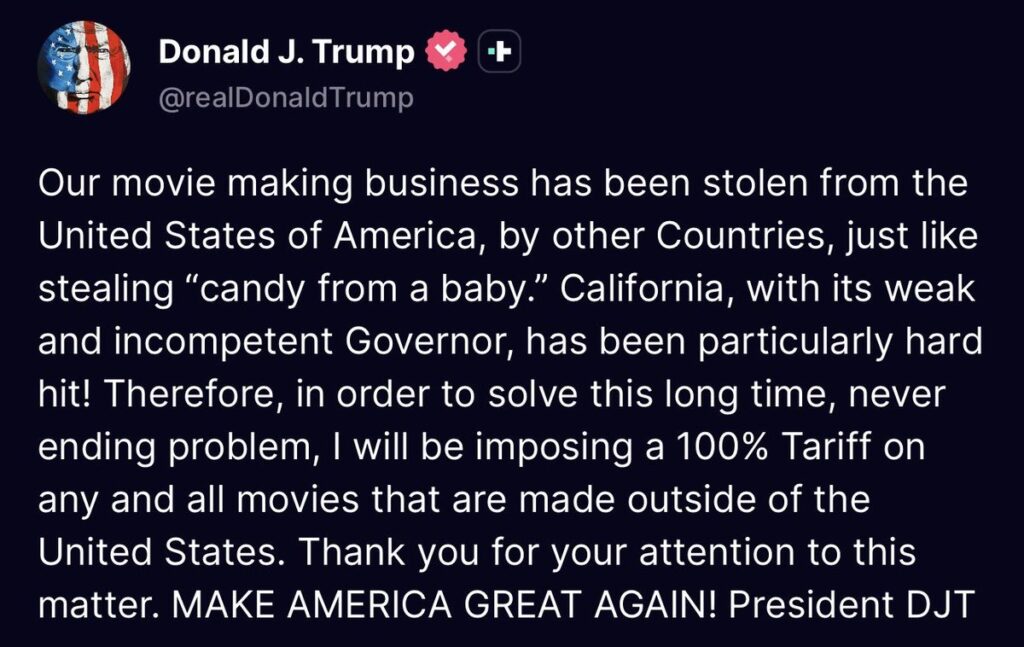 ಅವರು ಮುಂದುವರಿದು, “ಈ ದೀರ್ಘಕಾಲದ, ಎಂದಿಗೂ ಮುಗಿಯದ ಸಮಸ್ಯೆಗೆ ಪರಿಹಾರ ನೀಡಲು, ಅಮೆರಿಕ ಹೊರಗೆ ತಯಾರಾಗುವ ಎಲ್ಲ ಸಿನಿಮಾಗಳ ಮೇಲೆ 100% ಸುಂಕ ಹೇರಲಾಗುತ್ತದೆ. ಇದರಿಂದ ಅಮೆರಿಕದ ಉದ್ಯಮ ಮತ್ತೆ ಬಲ ಪಡೆಯುತ್ತದೆ” ಎಂದು ತಿಳಿಸಿದ್ದಾರೆ.