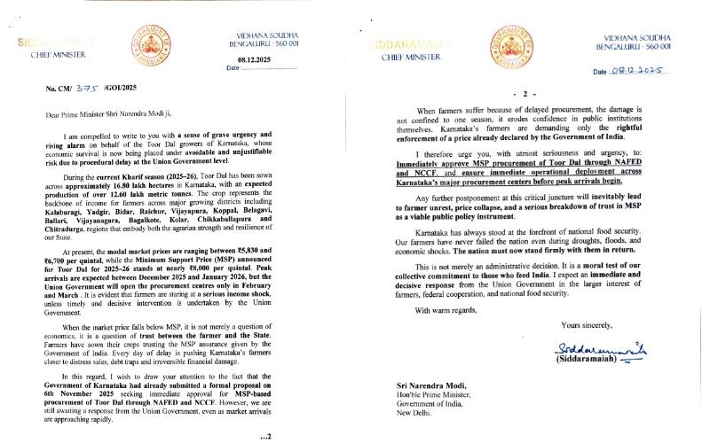 ಸಂ.ಕ.ಸಮಾಚಾರ ಬೆಂಗಳೂರು: ರಾಜ್ಯದ 13ಕ್ಕೂ ಹೆಚ್ಚು ಜಿಲ್ಲೆಗಳಲ್ಲಿ ಪ್ರಮುಖ ಬೆಳೆಯಾಗಿರುವ ತೊಗರಿಬೇಳೆ(ತೂರ್ದಾಲ್) ಯನ್ನು ಕನಿಷ್ಠ ಬೆಂಬಲ ಬೆಲೆಯಲ್ಲಿ ಕರ್ನಾಟಕ ಸರ್ಕಾರವು ನಫೆಡ್ ಮತ್ತು ಎನ್ಸಿಸಿಎಫ್ ಮುಖೇನ ಖರೀದಿಸಲು ಅನುಮೋದನೆ ನೀಡುವಂತೆ ಕೋರಿ ಪ್ರಧಾನಿ ನರೇಂದ್ರ ಮೋದಿ ಅವರಿಗೆ ಸಿಎಂ ಸಿದ್ದರಾಮಯ್ಯ ಸುದೀರ್ಘ ಪತ್ರ ಬರೆದಿದ್ದಾರೆ.